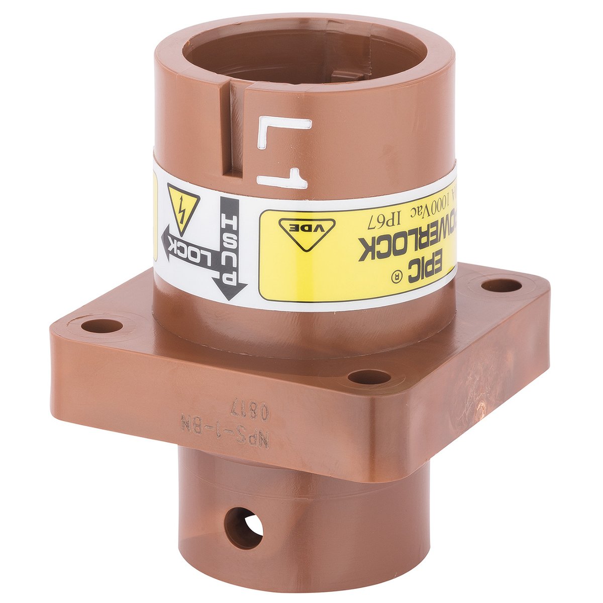 L’embase EPIC® Powerlock A1 S version L1 est conçue pour les connexions de type source dans des installations fixes à haute intensité. Grâce à son boîtier marron codé couleur pour la phase L1, elle s’intègre parfaitement dans les systèmes triphasés normalisés. Compatible avec des contacts à vis (non inclus), elle permet le raccordement de conducteurs de 50 à 120 mm² pour un courant jusqu’à 400 A, tout en assurant une étanchéité IP67 une fois installée.