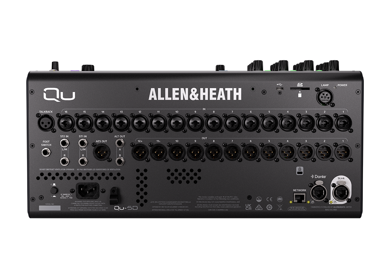 La QU-5D d'Allen & Heath est une console de mixage numérique compacte hautement performante, conçue pour offrir une qualité audio exceptionnelle, une flexibilité avancée et une intégration réseau simplifiée grâce à la connectivité Dante. Avec son nouveau processeur XCVI 96 kHz et ses fonctionnalités professionnelles, elle s'adresse autant aux ingénieurs du son exigeants qu'aux structures recherchant un système fiable, évolutif et intuitif.