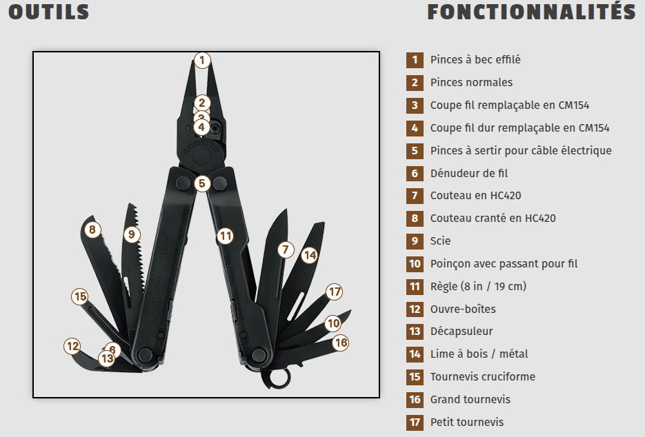 La Rebar Black de Leatherman est une pince multifonction robuste et compacte, conçue pour les professionnels comme pour les bricoleurs exigeants. Dotée de 17 outils essentiels, elle combine performance, durabilité et design ergonomique. Sa finition noire en oxyde lui confère une allure discrète et tactique, idéale pour une utilisation sur le terrain.