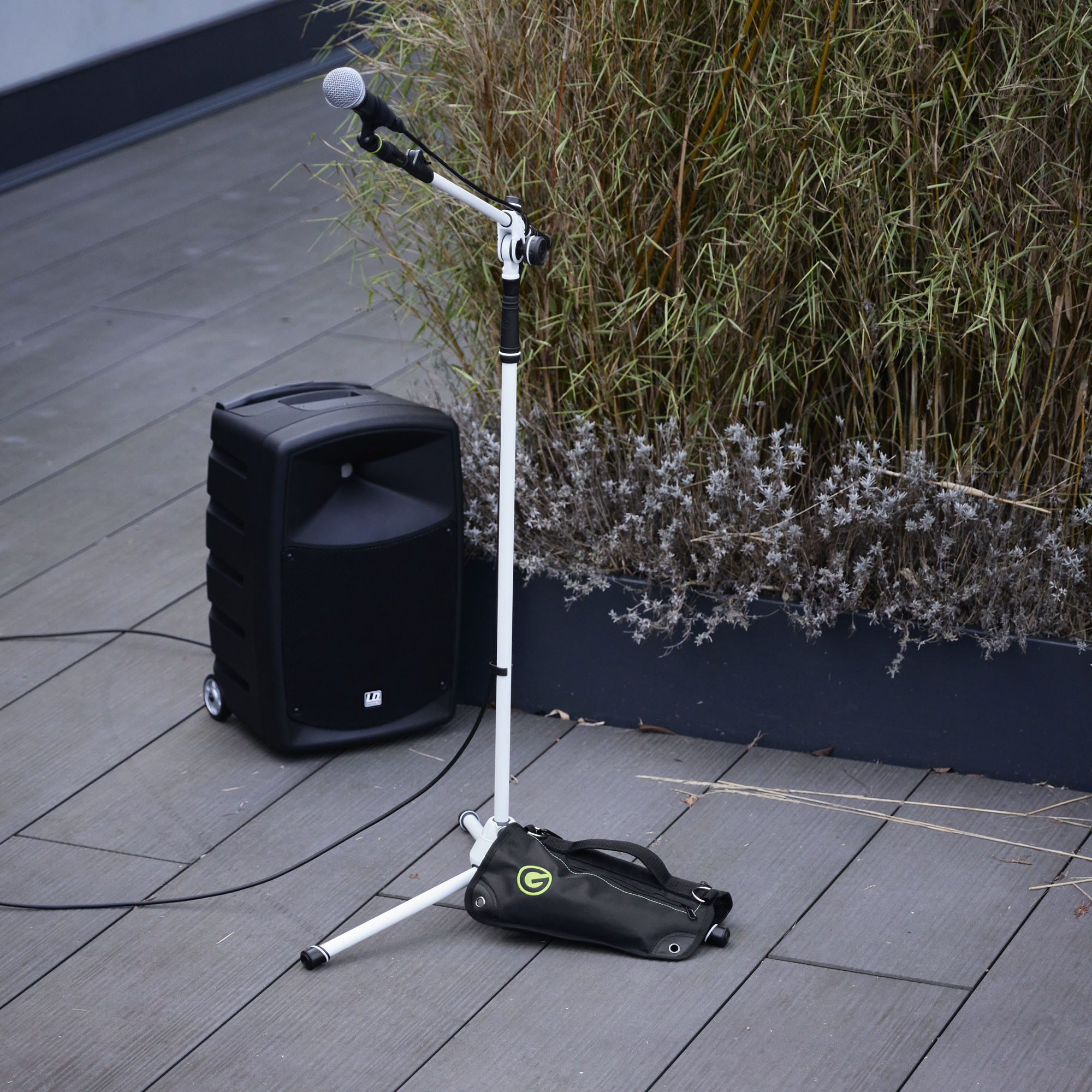 Tout est prêt et le spectacle peut commencer. C'est là que quelqu'un trébuche accidentellement sur un pied... Pour sécuriser et assurer la stabilité des équipements ô combien précieux (micros, enceintes, projecteurs, etc.), la gamme de pieds et accessoires Gravity® comprend désormais la nouvelle série de sacs de lestage BG SB, à remplir selon les besoins et qui se fixent aisément sur des embases trépieds. Outre les applications scéniques, les sacs BG SB sécurisent également les équipements de plateaux de tournage et de shooting, par exemple les boîtes à lumière ou les diffuseurs en hauteur monté(e)s sur embase trépied. Ces sacs stabilisent également les équipements des créateurs de contenus et podcaster, qui travaillent avec une longue perche pour des raisons pratiques ou un pied de table léger. Le sac de lestage Gravity® assure une stabilité fiable.