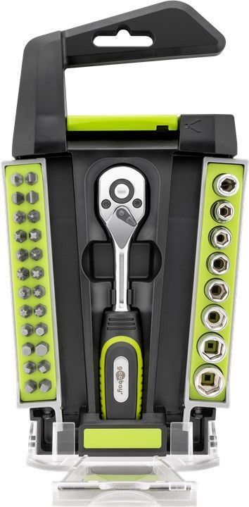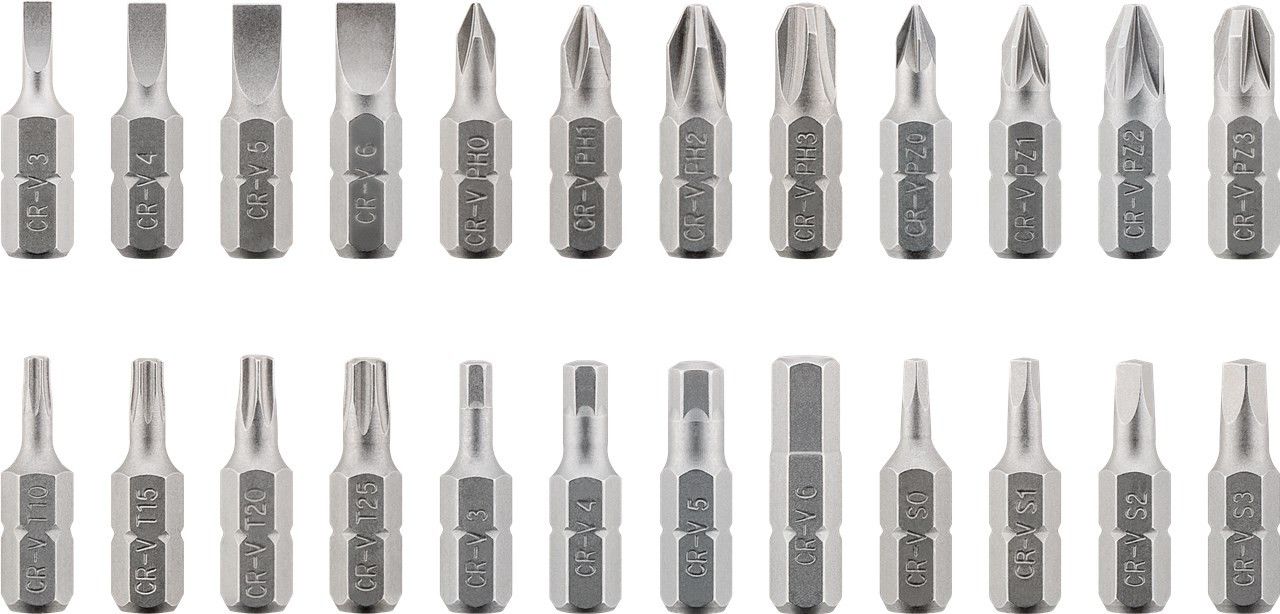 avec 24 embouts : 4x têtes plates : 3 mm, 4 mm, 5 mm, 6 mm 4x cruciformes (Phillips) : PH0, PH1, PH2, PH3 4x Pozidriv : PZ0, PZ1, PZ2, PZ3 4x Torx : T10, T15, T20, T25 4x à tête hexagonale : H3, H4, H5, H6 4x à tête carrée : S1, S2, S3, S4 1x support pour embouts avec 7x noix hexagonales et 1/4 de pouce : 5,5 mm, 6 mm, 7 mm, 8 mm, 9 mm, 10 mm, 11 mm