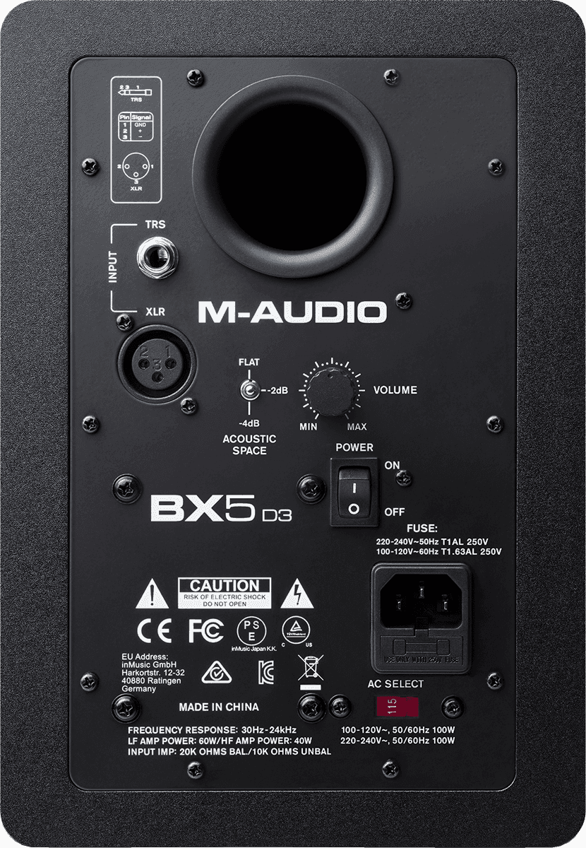 M-Audio lance une nouvelle image du monitoring en proposant une version évoluée de la BX5 D2. Sa bi-amplification de 100W RMS réparti sur un un haut parleur Kevlar 5 pouces (127mm) à 60 w et son nouveau tweeter en soie naturelle de 1 pouce (25mm) à 40w, lui permet de surpasser sa petite soeur à 70W RMS. C'est également le guide d'onde attributé au tweeter la nouveauté. Celui-ci (inexistant dans la version D2) permet une meilleure diffusion sonore et une élimination des hautes fréquences indésirables.