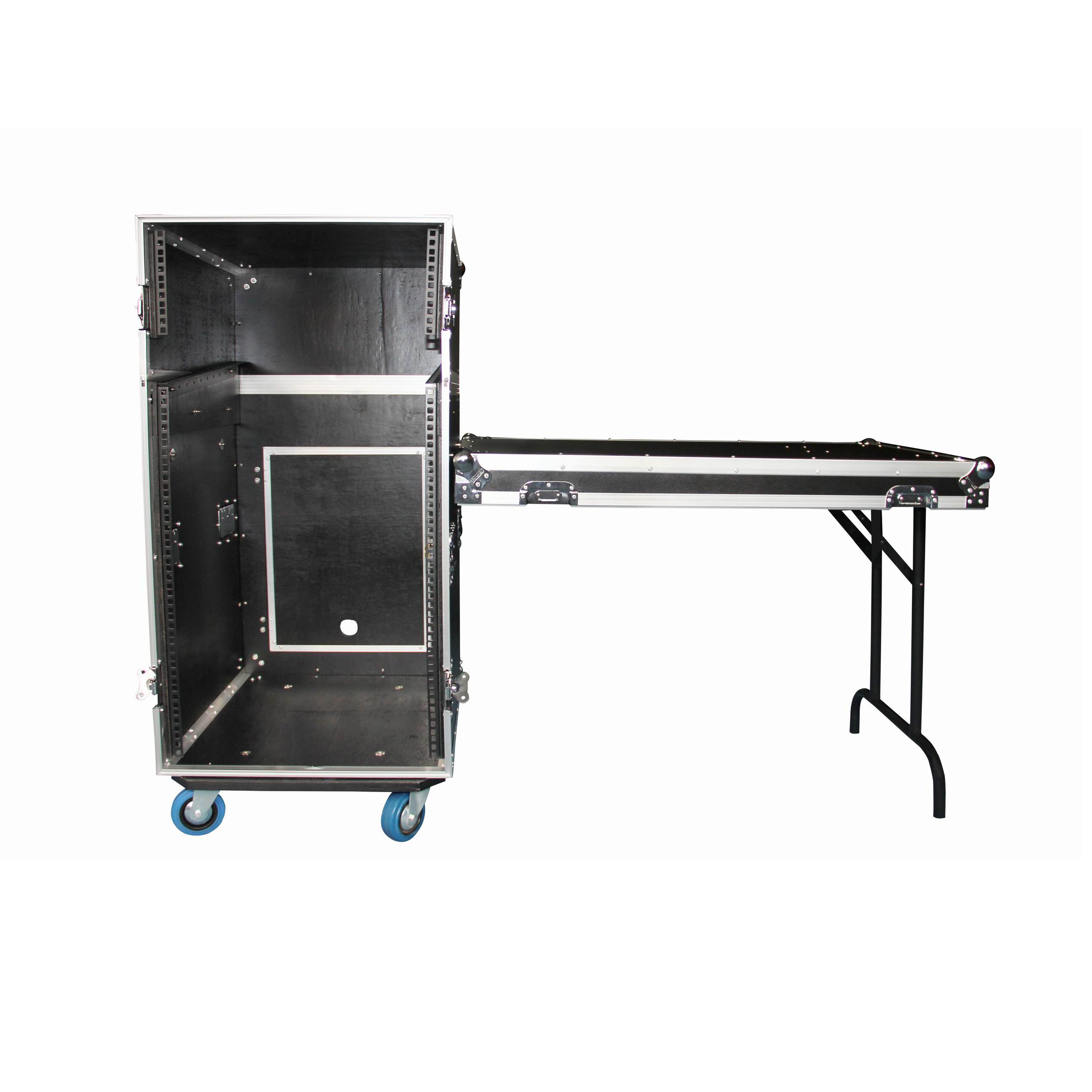 Flight case professionnel mobile tout-en-un. Configuration polyvalente offrant suffisamment d'espace pour mettre en rack des amplis, traitements de son ou tout type de produit au format rack 19’’. On peut également y loger un double lecteur CD, un mixeur 19" ainsi que des platines vinyles ou Cds sur le plateau. En quelques minutes, il est possible de ranger toutes les parties mobiles, il se transforme alors en un flight case classique sur roulettes.
