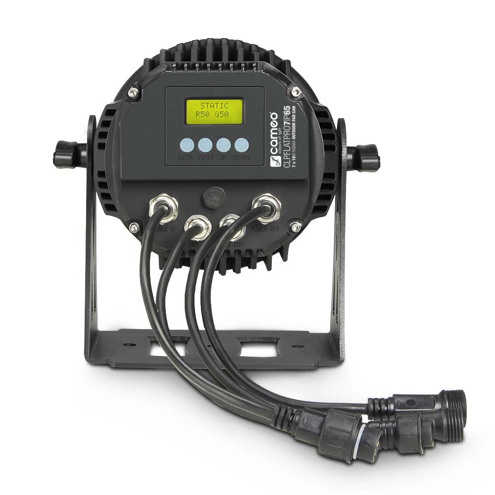 Le Cameo CLPFLATPRO7IP65 est totalement protégé contre la poussière et les projections d'eau sous faible pression, quelle que soit la direction. Le boîtier spécifique, en alliage moulé, possède des connecteurs à visser spécifiques pour les signaux DMX et l'entrée/renvoi secteur (ce qui permet de connecter jusqu'à 10 projecteurs en cascade). Le support universel autorise un grand nombre d'options de montage.