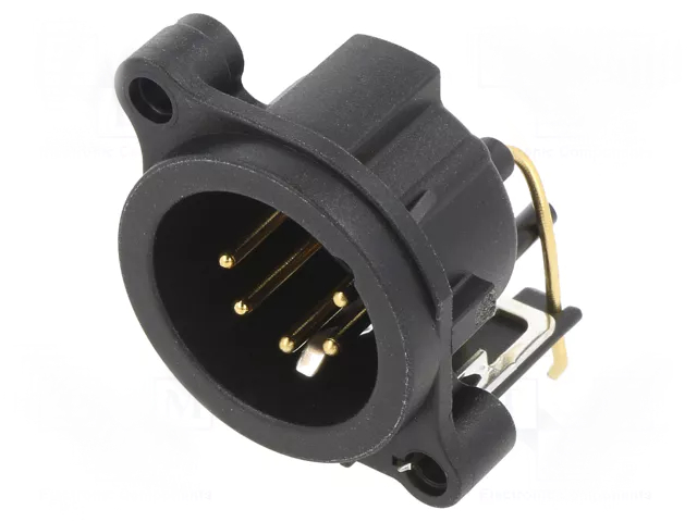 Embase XLR 5 points, mise à la masse : contact de masse séparé avec le corps du connecteur introduit et la face avant, montage horizontal sur circuit imprimé