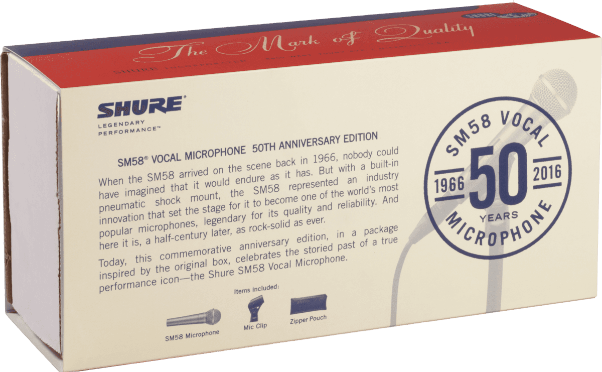 Le SM58-50A est une version en série limitée du SM58, à l'occasion du 50ème anniversaire du micro le plus utilisé dans le monde ! Il se différencie par une finition légèrement plus claire que l'original, une sérigraphie spéciale et est livré dans un packaging exclusif vintage.