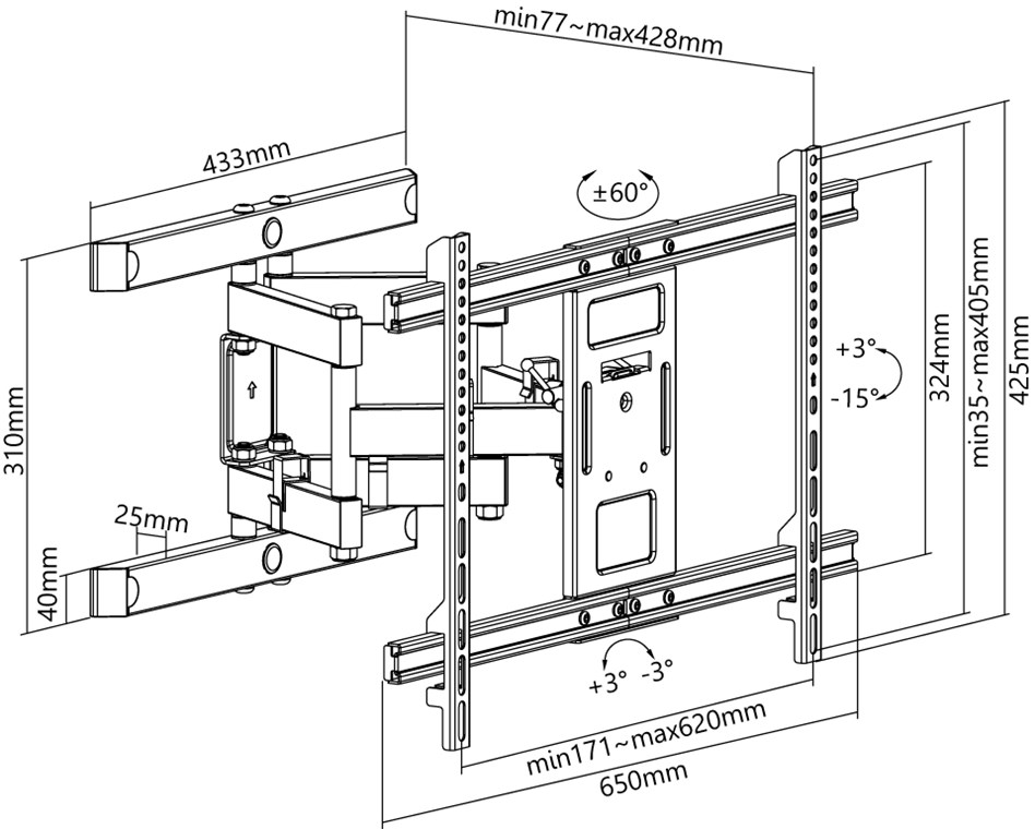 Le support mural maintient le téléviseur en position avec seulement 77 mm, élégamment plat et peu encombrant sur le mur, et peut être étendu jusqu'à 428 mm pour obtenir un angle de vision optimal.